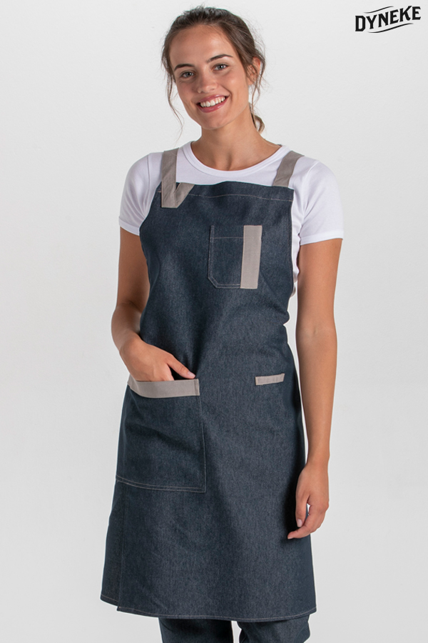 Delantal tejano envolvente con peto. Ajustable mediante cinta de espiga beig cruzada atrás con ojales metálicos. Amplio bolsillo inferior divisorio Y pequeño bolsillo en el pecho con contraste cinta beig. Trabilla horizontal para sujetar trapo. Abertura lateral inferior para mayor comodidad.Contraste cintas beig en bolsillos. Talla: ÚNICA. Largo 84 cm x 75 cm ancho.Propuestas: bares, terrazas, cafeterías, comercios y restauración